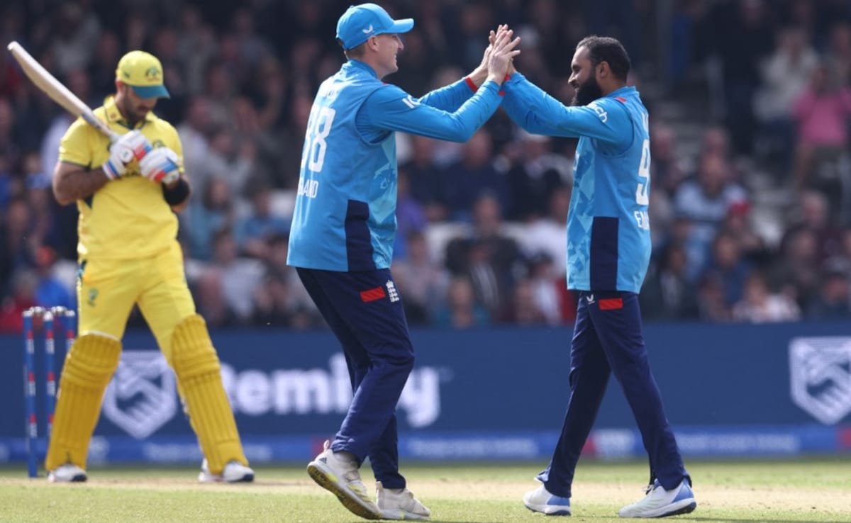 इंग्लैंड के आदिल रशीद (दाएं) दूसरे वनडे के दौरान विकेट लेने के बाद इंग्लैंड के हैरी ब्रूक (बीच…